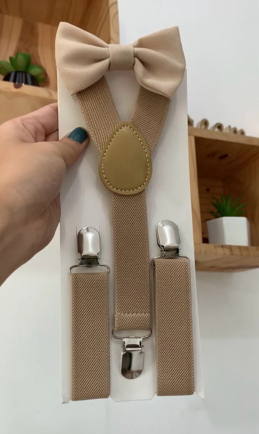 Este kit é composto por um suspensório ajustável e uma gravata borboleta, ambos na cor bege. Essa combinação traz um ar sofisticado que fará seu filho se destacar em qualquer evento. Além disso, o ajuste do suspensório permite que ele se encaixe confortavelmente em diferentes idades e tamanhos.